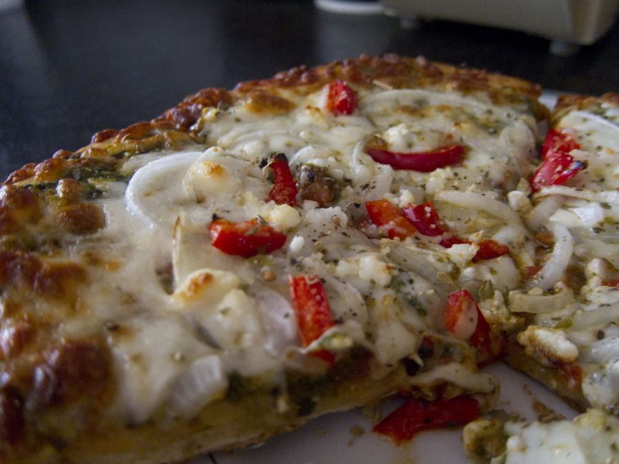 This is so simple its stupid. Amy's spinach frozen pizza (although pretty much any frozen pizza will do), and add your own toppings. For this one, I put onions, red peppers, some oregano, boucheron (goat cheese), parmesan and olive oil. NOW BAKE IT!